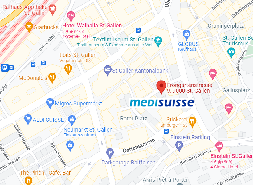 Via Autobahnausfahrt "Zentrum" gelangen Sie in die Innenstadt. Parkplätze finden Sie 100 m vom Gebäude der medisuisse entfernt in den Tiefgaragen "Oberer Graben" oder "Einstein". Für den Anfahrtsplan klicken Sie bitte hier.